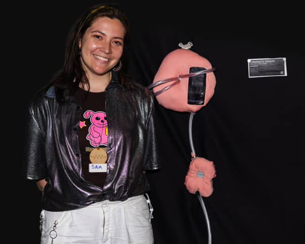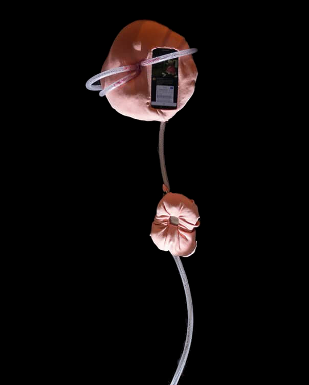 The physical sculpture comprises of an old recycled Google Pixel 3 as the "fast" screen and the "slow" screen is a 1.54in e-ink display. The two screens are embedded in an upholstered fabric housing, surrounded by braided vinyl tubing.