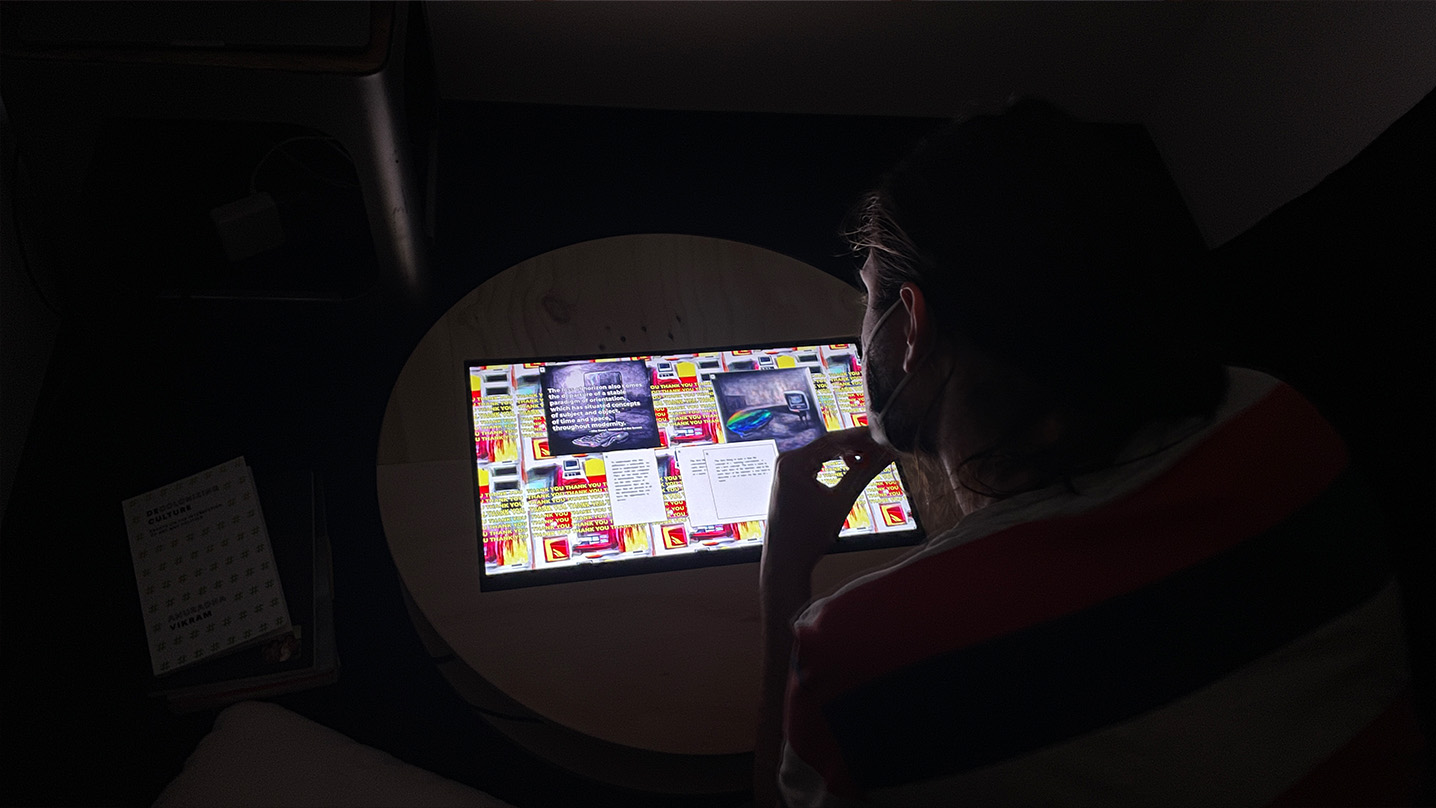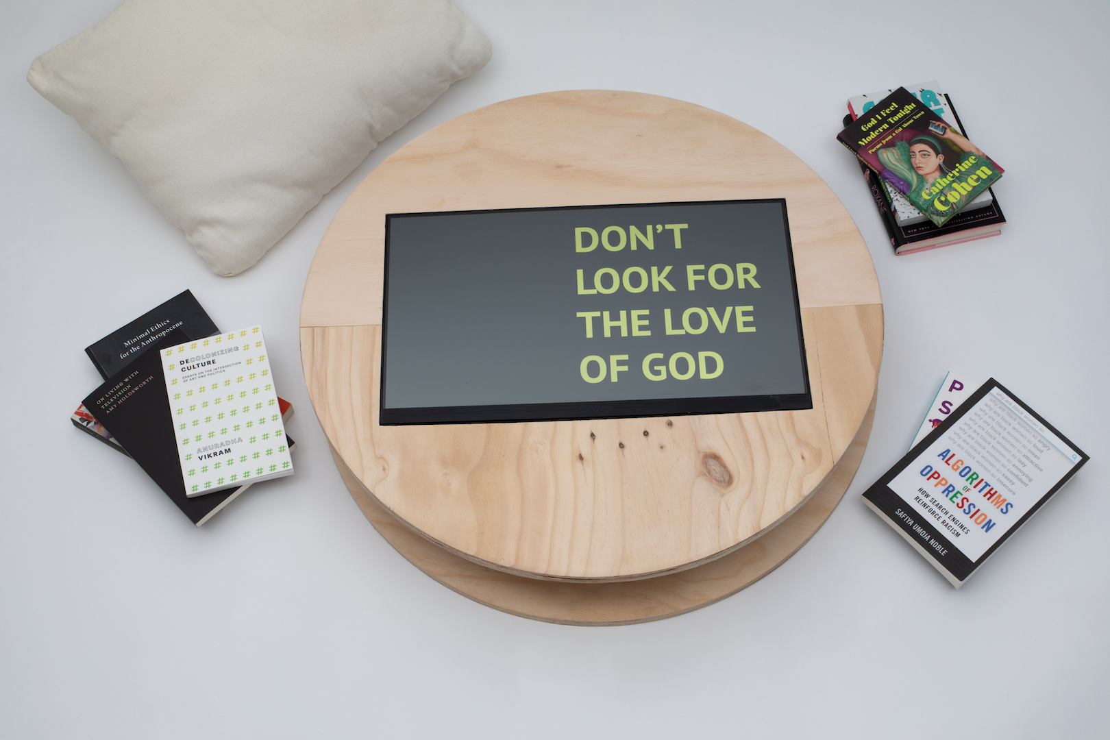 How the ritual actually physically manifests itself is through a touchscreen interface that has procedurally generated content. This interface is installed on a platform that the physical user must step up to and physically spin the touchscreen to begin the ritual. On the touchscreen is a series of early-2000 inspired popups, created using generated text and images. While the participant is partaking in the ritual, the computer is also participating, closing random windows when the user does. At the end of the ritual, the user chooses a song to add to the ambient playlist that will impact future worship.